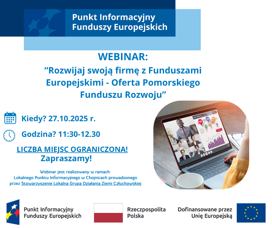 Lokalny Punkt Informacyjny Funduszy Europejskich w Chojnicach zaprasza na bezpłatne webinarium: Rozwijaj swoją firmę z Funduszami Europejskimi" - Oferta Pomorskiego Funduszu Rozwoju w dniu 27 października 2025 r. Platformie Microsoft Teams.