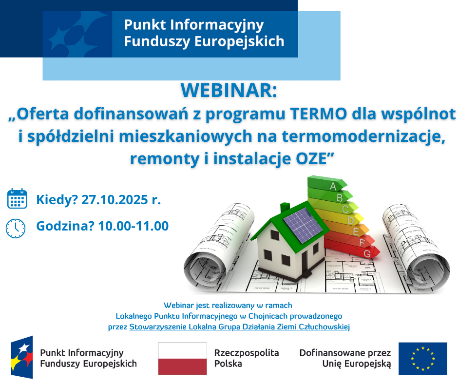Lokalny Punkt Informacyjny Funduszy Europejskich w Chojnicach zaprasza na bezpłatne webinarium „Oferta dofinansowań z programu TERMO dla wspólnot i spółdzielni mieszkaniowych na termomodernizacje, remonty i instalacje OZE”.