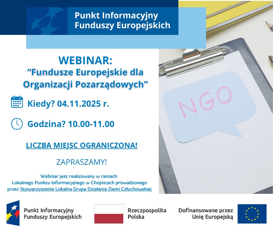 Lokalny Punkt Informacyjny Funduszy Europejskich w Chojnicach zaprasza na bezpłatne webinarium "Fundusze Europejskie dla organizacji pozarządowych".